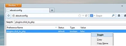 - Đối với Firefox: bạn nhập vào thanh địa chỉ about:config, sau đó tìm kiếm dòng plugins.click_to_play. Nhấp đôi chuột vào nó để thay đổi giá trị từ False thành True.