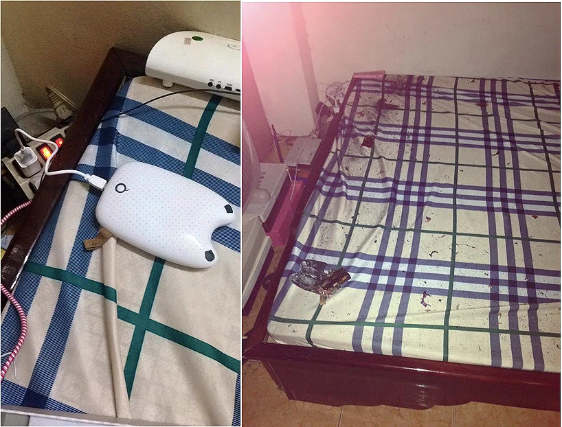 Trước đó, tại Đà Nẵng cũng xảy ra một vụ cháy nhỏ do sạc dự phòng phát nổ. Theo chia sẻ của Thảo Vy (nạn nhân): “Lần đầu tiên trong đời mình bị cảnh tượng như vậy, nghe nhiều người nói rồi mà vẫn không tin. Nghe người bán nói phải cắm sạc 8-10 tiếng nên mình đã sạc từ 7 giờ tối đến 4 giờ sáng thì nó phát nổ. Mặc dù biết là đồ Trung Quốc nhưng mình không nghĩ là nó nghiêm trọng như vậy. Khuyến cáo mấy anh/chị mua sạc Trung Quốc cẩn thận, từ nay em chừa luôn. Giữ được cái mạng là đã quá may mắn”.