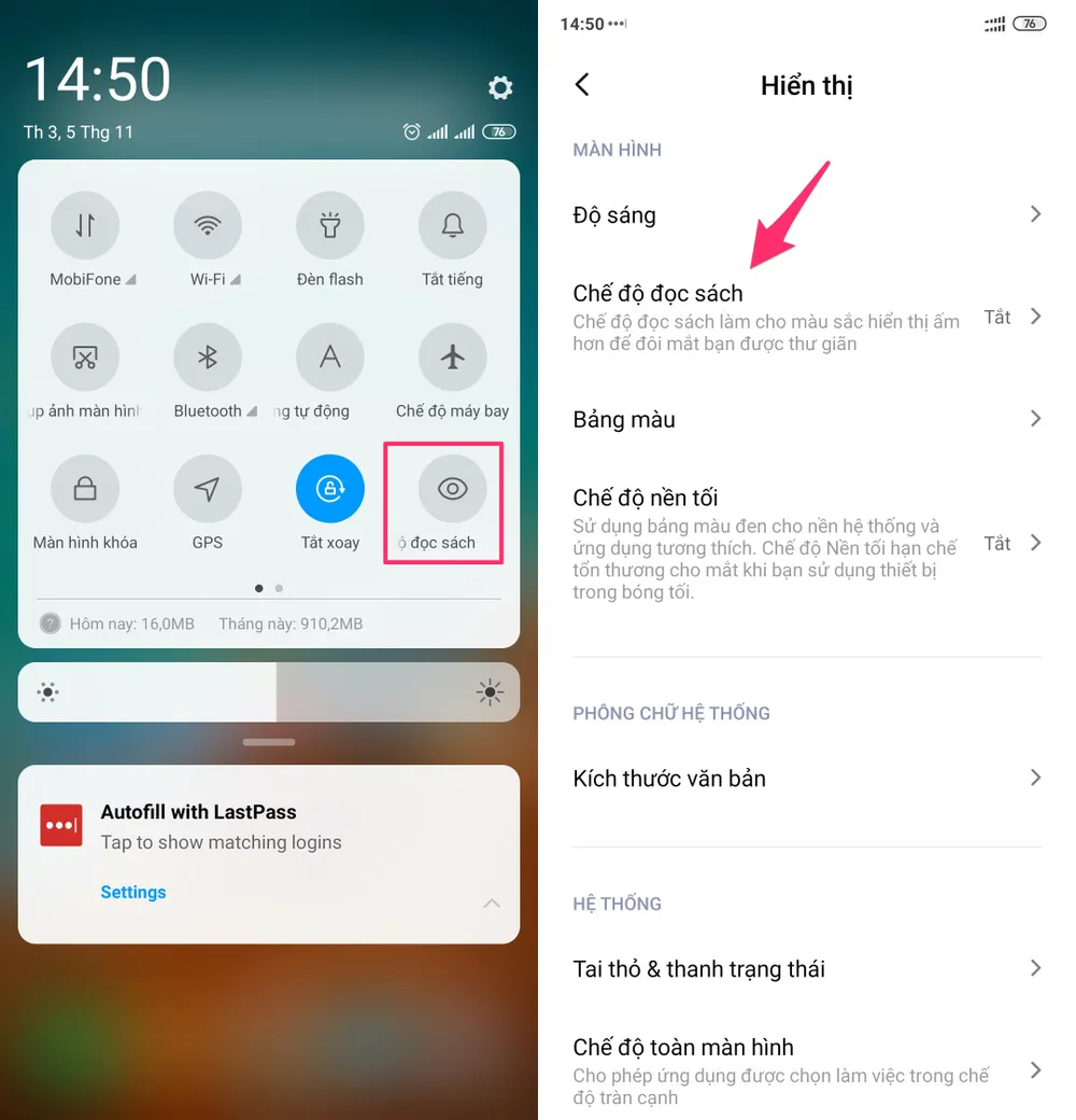 Kích hoạt chế độ đọc sách/ban đêm trên smartphone. Ảnh: TIỂU MINH