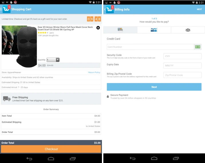 Đối với mỗi mặt hàng, bạn sẽ nhận được các thông tin về mức độ giảm giá, số lượng hàng tồn, giá bán hiện thời và giá gốc của nó. Nếu quan tấm đến sản phẩm nào đó, bạn có thể chọn xem giá sản phẩm và tiền thuế. Cuối cùng, bạn chạm vào nút Checkout và lựa chọn các phương thức thanh toán như thẻ tín dụng, PayPal,…Đa phần thì toàn bộ các mặt hàng mua tại Wish đều được giao miễn phí đến tận nhà nên người dùng có thể yên tâm.