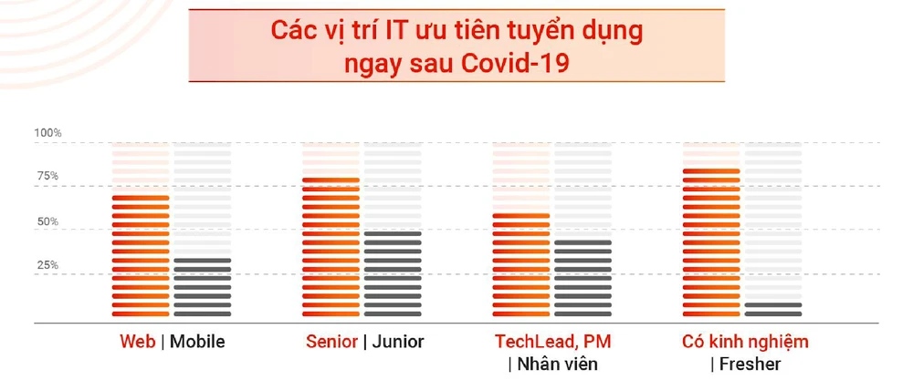 Ngay sau đại dịch, một số vị trí nhận được sự ưu tiên trong công tác tuyển dụng. Có thể thấy, doanh nghiệp chú trọng những vị trí thuộc cấp quản lý, đáng chú ý là nhân lực có kinh nghiệm nhận được sự quan tâm rất chênh lệch so với fresher (sinh viên CNTT mới ra trường hoặc có 1-2 năm kinh nghiệm).