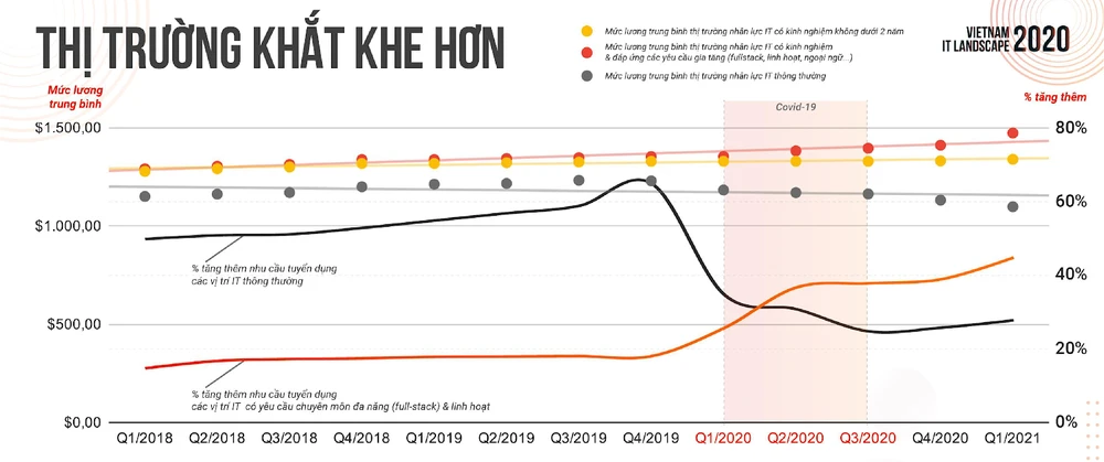 Điều này thể hiện rõ nhất ngay ở giai đoạn COVID-19, các nhân sự IT đa năng hơn, đáp ứng nhu cầu khắt khe hơn sẽ được trọng dụng với mức lương trung bình tăng nhanh hơn trung bình thị trường.