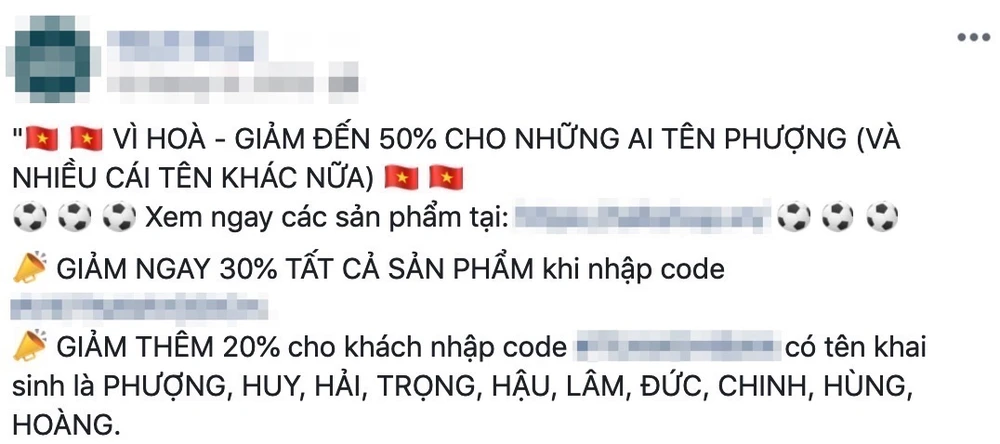 Bên cạnh đó, một số cửa hàng kinh doanh ăn uống cũng áp dụng các chương trình khuyến mãi, giảm giá cho những khách hàng có tên trùng với tên các cầu thủ ghi bàn trong trận đấu như Công Phượng, Tiến Dũng… “Vì HÒA nên giảm giá 50% cho những ai tên Phượng, giảm thêm 20% cho những khách có tên khai sinh Phượng, Huy, Hải, Trọng, Hậu, Hoàng, Chinh…”