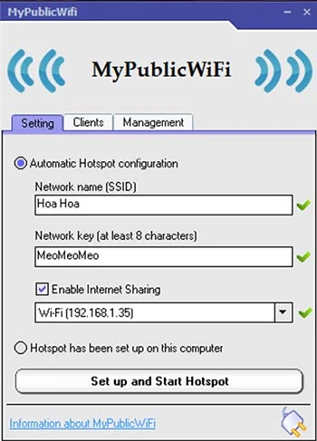 Nếu muốn biến máy tính thành điểm phát sóng không dây theo các thiết lập mặc định của MPW thì đánh dấu chọn vào mục Hotspot has been set up on this Computer, rồi nhấn Start Hotspot và chờ một lát để hoàn tất. Thẻ Clients bên cạnh sẽ hiển thị danh sách các máy tính hoặc thiết bị đang truy cập vào mạng do bạn tạo ra.