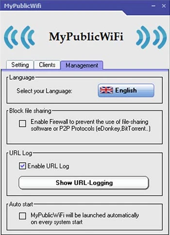 Để thay đổi một số thiết lập của chương trình, bạn chuyển sang thẻ Management. Tại đây, bạn có thể lựa chọn lại ngôn ngữ hiển thị, hoặc đánh dấu chọn vào mục Block file sharing nếu như muốn cấm máy khách sử dụng các chương trình chia sẻ tập tin hoặc phần mềm qua giao thức P2P (điều này hạn chế được việc băng thông bị hút từ các ứng dụng như eDonkey, Utorrent, BitTorrent…).
