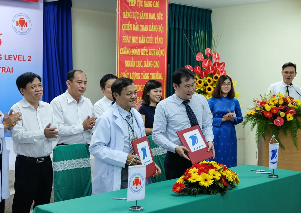 Giám đốc BV Nguyễn Trãi - BS Võ Văn Tiến và đại diện phía VNPT ký kết triển khai VNPT HIS level 2. Ảnh: TIỂU MINH