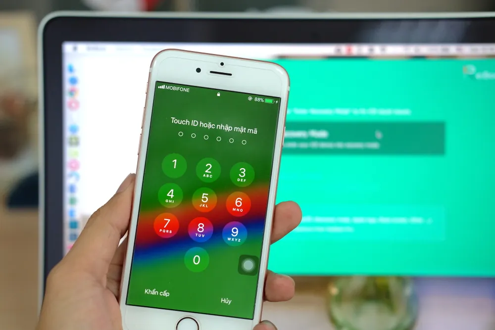 Đối với iPhone 7 trở về sau, bạn hãy nhấn và giữ nút giảm âm lượng cho đến khi thấy xuất hiện logo Apple. Kết nối với máy tính thông qua cáp USB, thả nút giảm âm lượng khi thấy thông báo Connect to iTunes trên màn hình điện thoại.