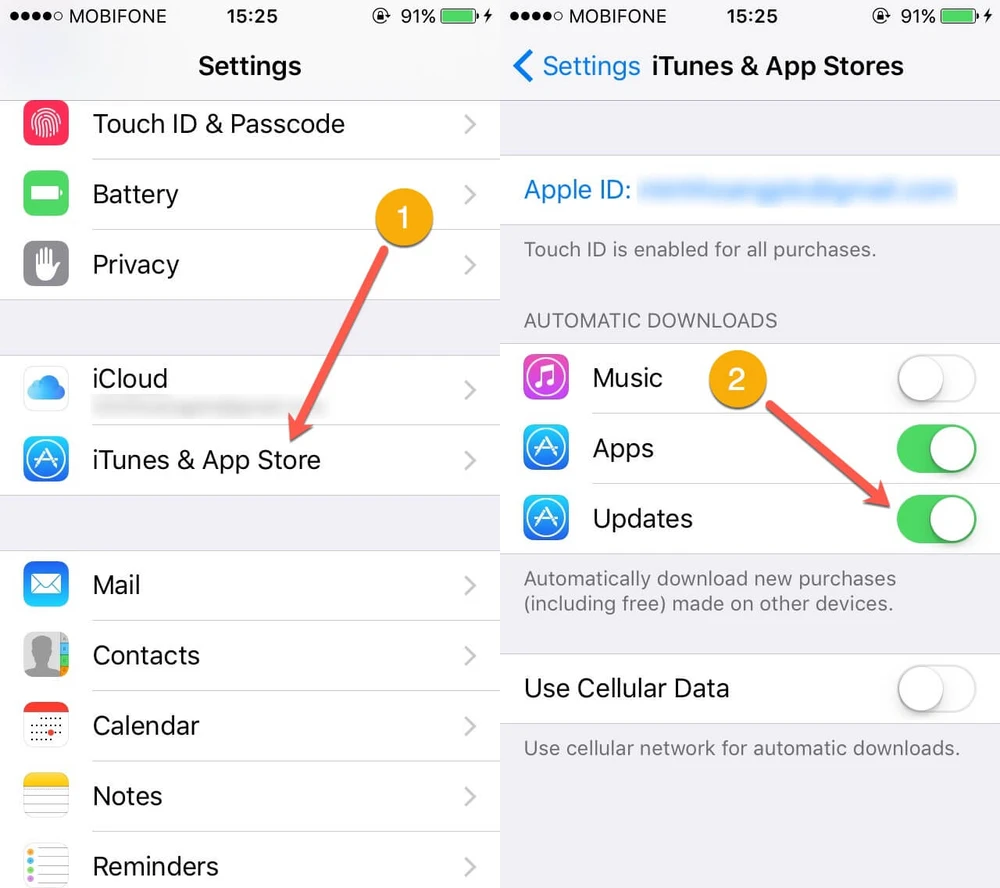 Có hai cách để thực hiện việc này, đầu tiên bạn hãy truy cập vào Settings > iTunes & App Store, sau đó vô hiệu hóa tùy chọn Updates (cập nhật phần mềm). Nếu giải pháp này không giúp khắc phục vấn đề, bạn có thể chuyển sang cách tiếp theo.