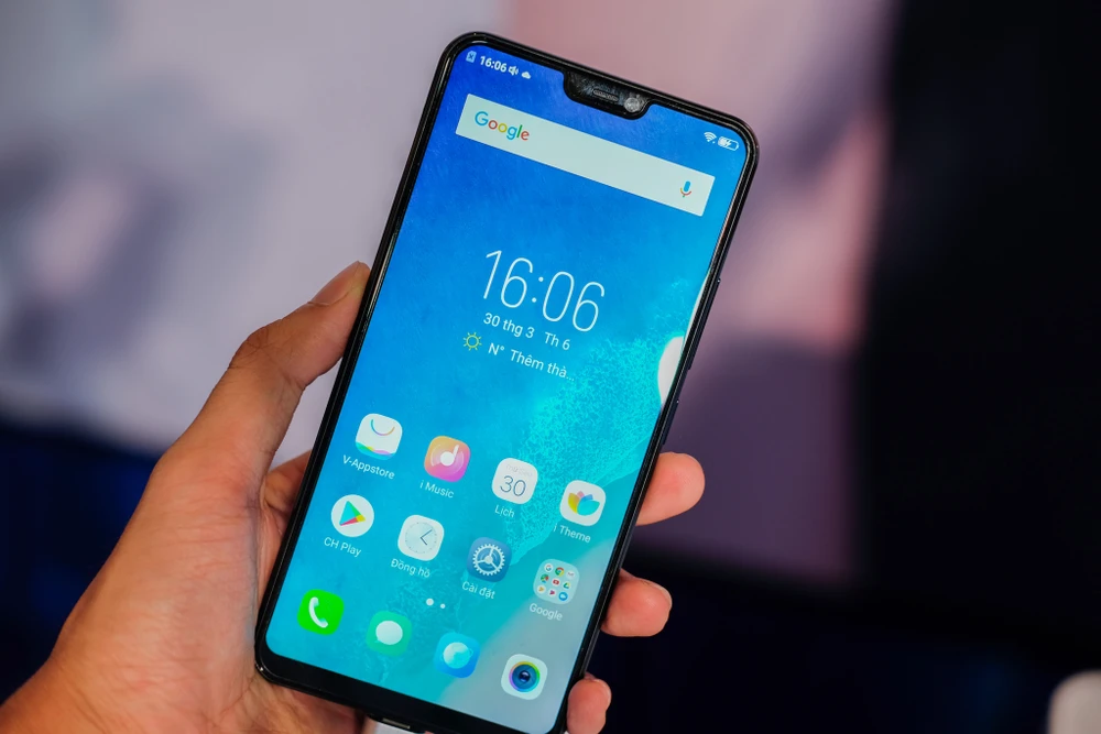 Vivo V9 được trang bị màn hình lớn 6.3 inch nhưng cho cảm giác cầm nắm thoải mái như máy 5.5 inch. Sản phẩm sở hữu màn hình tỉ lệ 19:9, kích thước màn hình tăng thêm 5.2% so với Vivo V7+, đồng thời viền màn hình giảm 19% với độ mỏng chỉ còn 1.75 mm. Các góc bo tròn và mặt lưng được thiết kế cong đem lại cảm giác cầm nắm thoải mái.