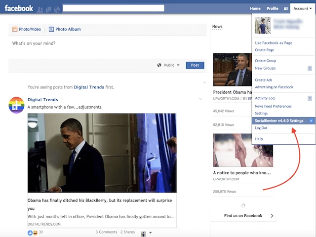 - Bước 3: Giao diện Facebook lúc này sẽ được chuyển về kiểu cũ và xuất hiện thêm tùy chọn Account ở góc trên bên phải. Người dùng chỉ cần nhấp vào đó và chọn SocialReviver v4.4.9 Settings.