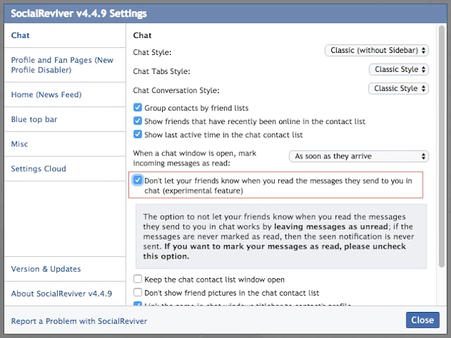 - Bước 4: Để vô hiệu hóa tính năng Seen trong cửa sổ trò chuyện, người dùng chỉ cần đánh dấu chọn vào ô Don’t let your friends know when you read messages they send to you in chat (experimental feature).
