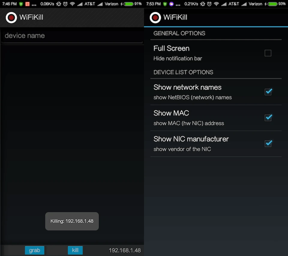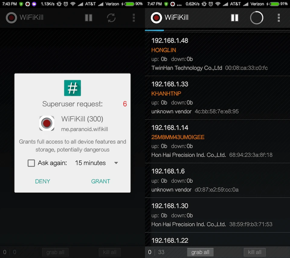 - Bước 4: Để “đá” (tức là chỉ ngắt kết nối tạm thời) một thiết bị bất kỳ, bạn hãy chọn vào đó rồi nhấn Grab. Ngược lại, nếu muốn chặn hoàn toàn, bạn hãy nhấn vào nút Kill.