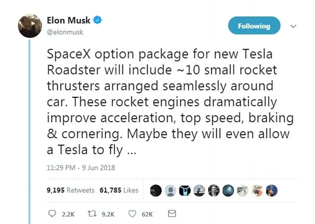 Trong một bài viết đăng tải trên Twitter, Elon Musk tiết lộ phiên bản mới của mẫu xe điện Tesla Roadter sẽ có thêm gói tùy chọn tích hợp 10 bộ đẩy tên lửa nhằm tăng tốc độ đáng kể, cải thiện khả năng phanh, vào cua và thậm chí là bay...