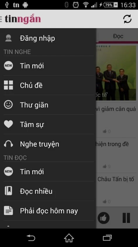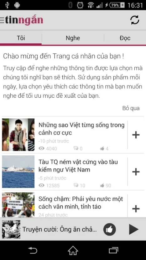 Giao diện chính của chương trình được chia ra thành 3 phần là Tôi (nơi lưu lại các tin tức mà bạn yêu thích), Nghe (ứng dụng sẽ đọc tin cho bạn) và cuối cùng là Đọc (hiển thị các tin tức tổng hợp nóng nhất trong ngày).
