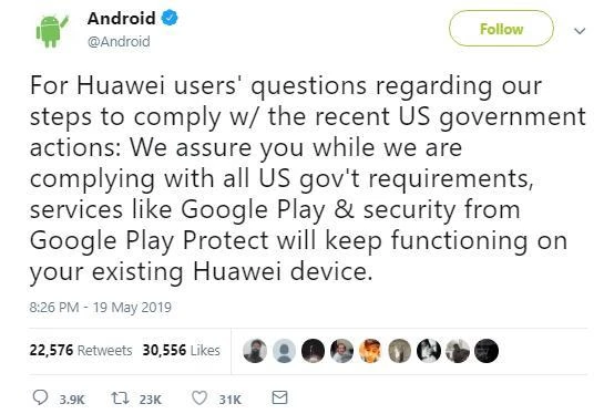 Trên trang chính thức của Android, Google cũng xác nhận: “Google Play và các giải pháp bảo vệ từ Google Play Protect sẽ tiếp tục được vận hành trên các thiết bị Huawei sẵn có”. Điều này có nghĩa, người dùng smartphone Huawei hiện nay hoàn toàn yên tâm vì sẽ có các bản cập nhật phần mềm trong tương lai, các ứng dụng của Google như Gmail, YouTube… tiếp tục sử dụng bình thường. Thông cáo chính thức từ Google dập tắt hoàn toàn những sai lệch trước đó khi nói rằng điện thoại Huawei không được cập nhật phần mềm mất tất cả khả năng truy cập vào các dịch vụ của Google.