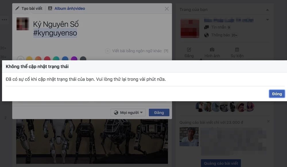 Cụ thể, khi đăng một nội dung bất kì (văn bản, hình ảnh, liên kết…) lên trang Facebook cá nhân rồi nhấn Post (đăng), bạn sẽ thấy xuất hiện thông báo lỗi There was a problem updating your status. Please try again in a few minutes (đã có sự cố khi cập nhật trạng thái của bạn. Vui lòng thử lại trong vài phút nữa).
