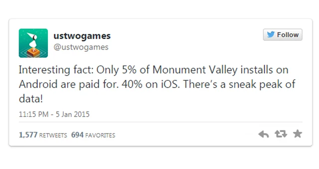 Chính vì thế có lẽ người dùng Android không thích mua một trò chơi dù nó đang hot, ngược lại thì với iOS người dùng có phần khá giả hơn, có tải khoản visa đễ dễ dàng mua ứng dụng nên chính vì lẽ đó mà có lẽ trò chơi Monument Valley lại có con số chênh lệch đến thế.