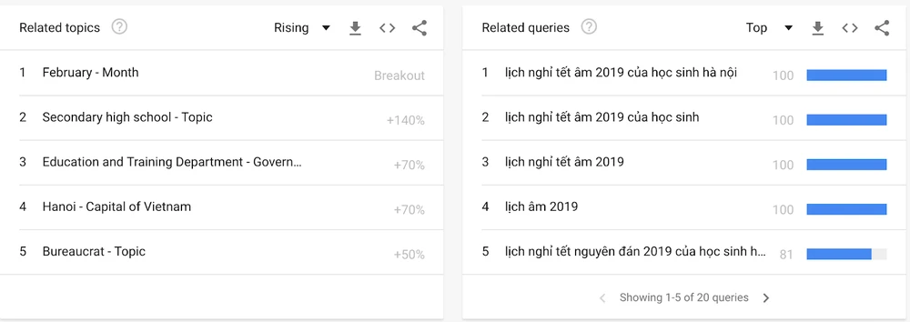 ‘Còn bao nhiêu ngày nữa là tết âm', ‘lịch nghỉ tết âm 2019' hay ‘lịch nghỉ tết 2019 của học sinh Hà Nội’... vào nhóm được tìm kiếm nổi bật theo xu hướng người dân tra cứu thời gian để lên lịch cho các chuyến du xuân.