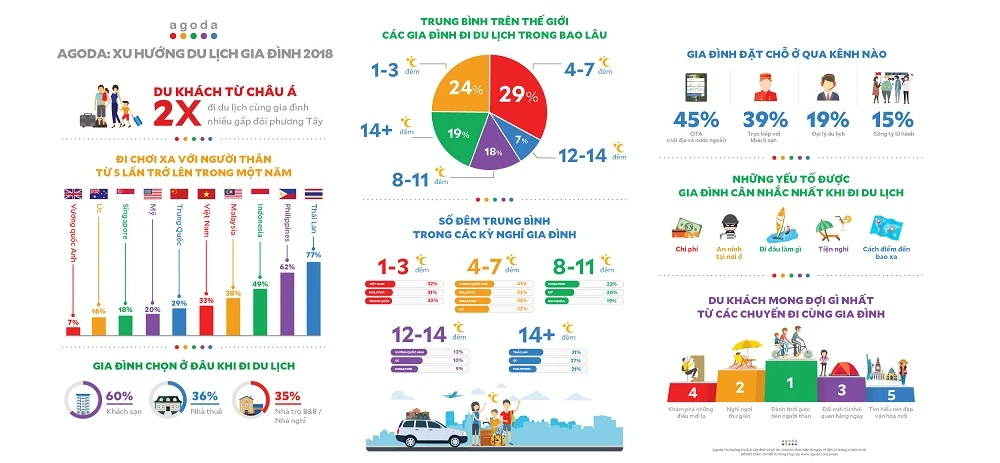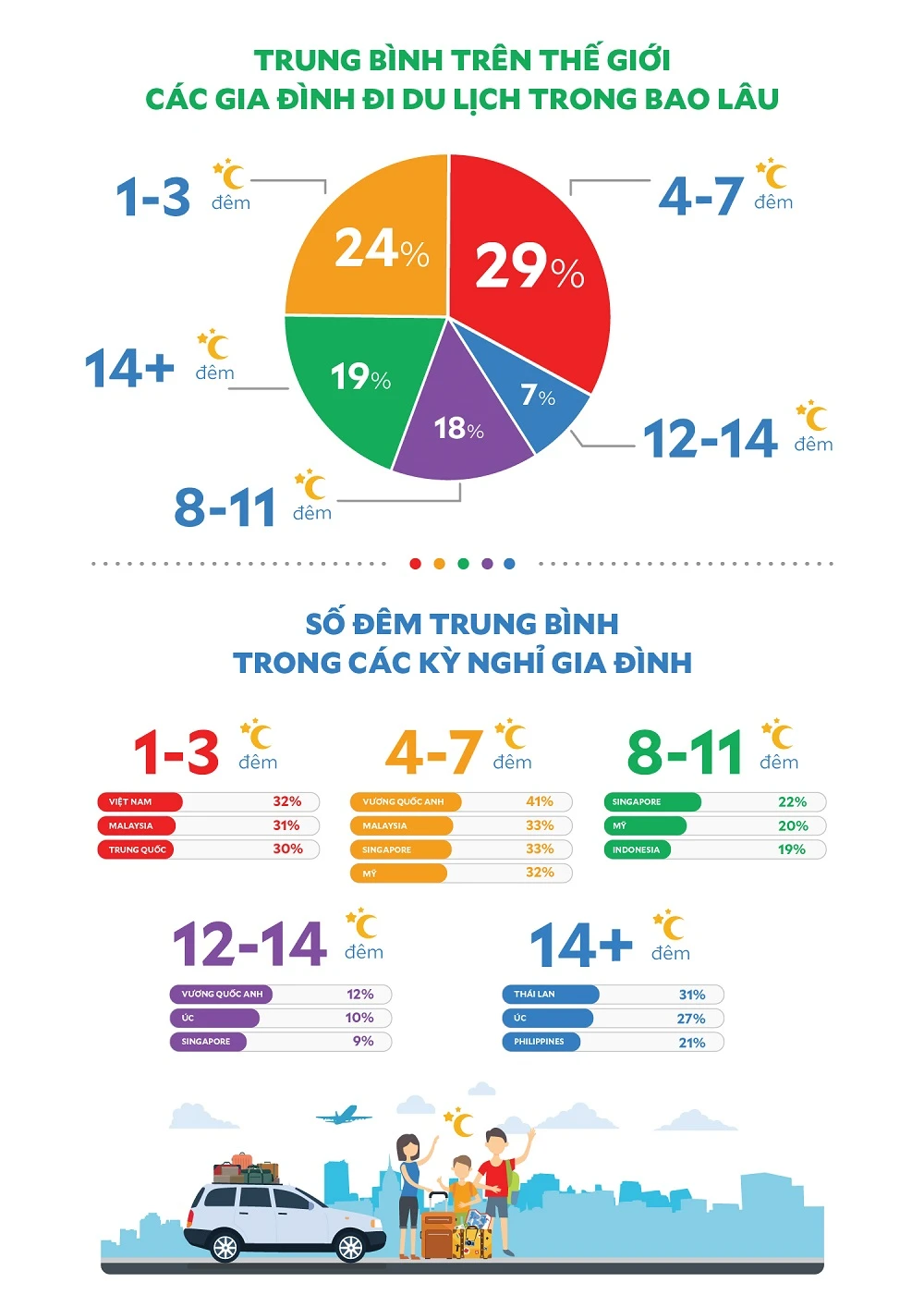 Xu hướng du lịch gia đình đang “bùng nổ” chung trên toàn cầu. Một kỳ nghỉ phổ biến thường kéo dài 4-7 đêm, tuy nhiên cũng có sự chênh lệch lớn ở các quốc gia. Hầu hết các gia đình người Việt Nam, Malaysia và Trung Quốc có sở thích lựa chọn kỳ nghỉ từ 1-3 đêm.