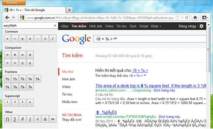 Bạn đọc quan có thể tải tạihttp://goo.gl/OsuCBf, tương thích Firefox 8 – 34. Để cài đặt bạn nhấn vào nútAdd to Firefox, chờ một vài giây rồi chọn Install Now. Sau đó, bạn cần khởi động lại trình duyệt thì mới sử dụng được. EasyMath hiển thị được các ký hiệu toán học trong hầu hết các phông chữ phổ biến, cho phép sử dụng trên một trang web bất kì mà không xảy ra vấn đề về tương thích. Một khi đã cài đặt thành công, bạn có thể mở thanh công cụ của nó bằng tổ hợp phímCtrl + M hoặc nhấp vào menu View > Sidebar > easyMath.