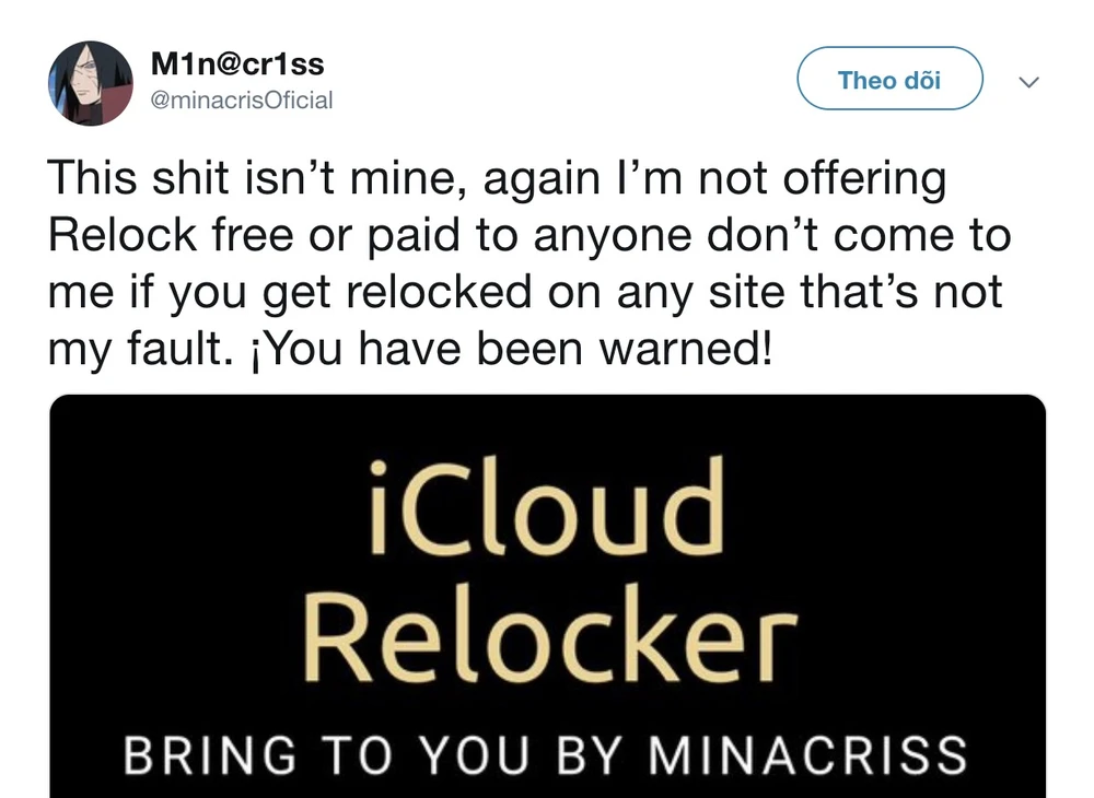 Tuy nhiên, trên trang Twitter chính thức của nhóm, Minacriss cho biết họ không liên quan gì đến công cụ khóa iCloud từ xa, đồng thời khẳng định việc này không mang lại bất kì lợi ích gì.