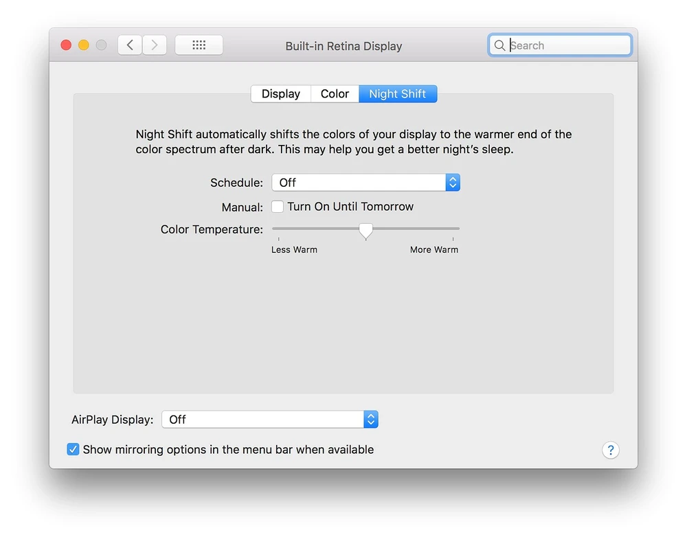 - Tương tự, đối với những ai đang sử dụng macOS, bạn có thể kích hoạt tính năng Night Shift để giảm các tia sáng xanh phát ra từ màn hình máy tính vào ban đêm. Tính năng này hiện chỉ có từ bản cập nhật 10.12.4 trở đi. Nếu chưa nâng cấp, người dùng chỉ cần mở Mac App Store, chuyển sang thẻ Update và kiểm tra bản cập nhật. Sau khi hoàn tất cập nhật, bạn có thể kích hoạt Night Shift thông qua phần Displays của System Preferences. Mặc định, tính năng này được thiết lập tự động bật vào lúc mặt trời lặn (Sunset) và tự động tắt vào lúc mặt trời mọc (Sunrise).
