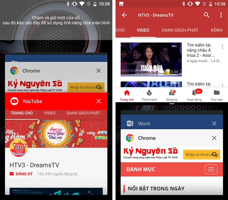 Cụ thể khi mở nhiều ứng dụng cùng lúc, để kích hoạt chia đôi màn hình người dùng bấm vào phím đa nhiệm là biểu tượng hình vuông nằm bên phải trong 3 phím điều hướng trực tiếp trên màn hình. Kế đến chọn ứng dụng cần chia đôi và kéo thả lên phía trên của màn hình thì lập tức máy sẽ chia đôi thành 2 màn hình. Trường hợp muốn bỏ tính năng này chỉ cần chạm 2 lần liên tiếp vào biểu tượng phím đa nhiệm thì máy sẽ lập tức trở về trạng thái một màn hình.