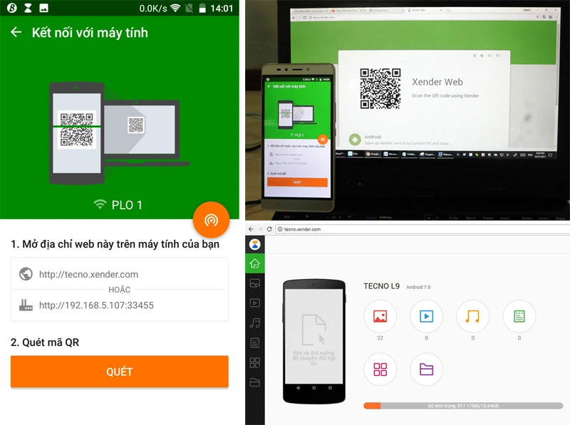 Theo đó, người dùng sử dụng Tecno L9 đã có kết nối mạng WiFi hoặc 3G và máy tính cũng đã có sẵn kết nối Internet. Việc sử dụng khá đơn giản, người dùng chỉ cần chọn ứng dụng Xender rồi bấm vào mục kết nối với máy vi tính, khi đó màn hình sẽ hiển thị thông báo đề nghị trên máy tính hoặc laptop gõ địa chỉ trang web tecno.xender.com.