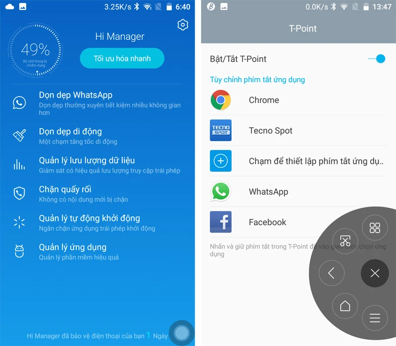 Bên cạnh đó, Tecno L9 cũng hỗ trợ ứng dụng phím tắt T-point và trên màn hình xuất hiện một chấm tròn có thể di chuyển khắp màn hình. Với T-point, người dùng có thể đặt thêm những ứng dụng cần mở nhanh như Facebook, web hoặc tùy biến các ứng dụng theo danh sách yêu thích. Ngoài ra, T-point cũng hỗ trợ chụp ảnh màn hình nhanh dành cho những người thích lưu lại thông tin vừa mới xem.