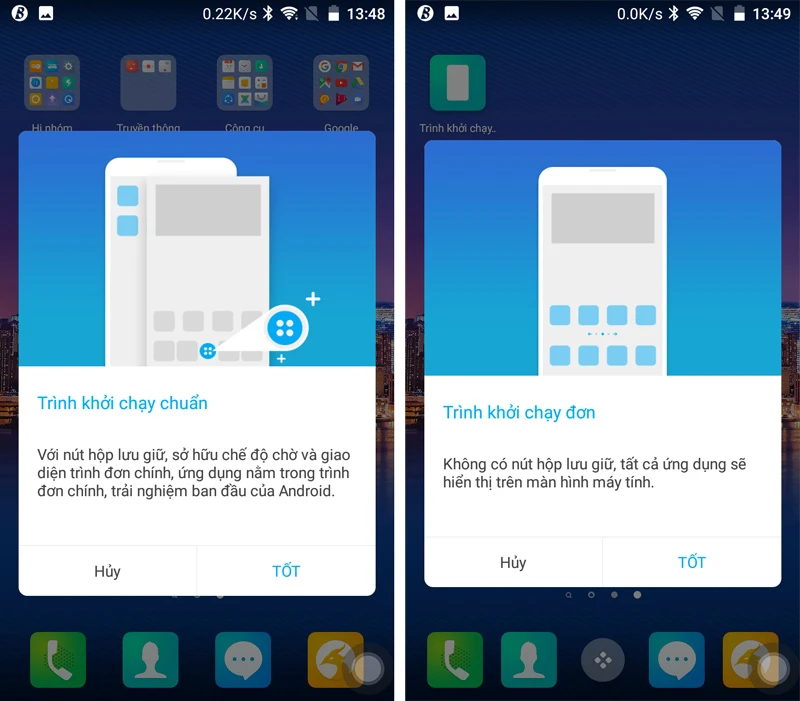 Một ứng dụng khá hay cũng được Tecno L9 tích hợp trong HiOs chính là thay đổi cách thức trình bày giao diện màn hình, không có nhiều sản phẩm smartphone di động tích hợp tính năng này. Cụ thể người dùng bấm vào ứng dụng Trình khởi chạy đơn thì máy lập tức cho phép người dùng chuyển đổi qua lại hai bộ giao diện truyền thống với nút vào menu chứa ứng dụng nằm ở giữa hay rút gọn và trình bày toàn bộ ứng dụng trên màn hình.