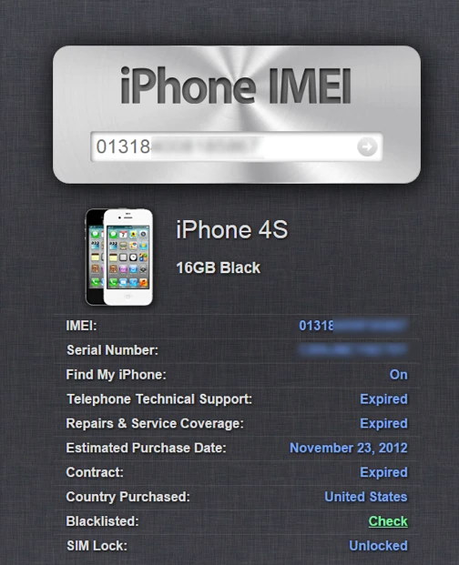 Một cách khác là truy cập vào trang web http://iphoneimei.info, nhập số IMEI thiết bị vào ô trống rồi nhấn nút để tra cứu. Ngay lập tức, những thông tin về thiết bị sẽ xuất hiện gồm Số serial (Serial number), Ngày mua máy (Estimated Purchase Date), Quốc gia mua máy (Country Purchased), tình trạng hợp đồng (Contract). Ở phần SIM Lock nếu kết quả trả về là Unlocked đồng nghĩa thiết bị là bản quốc tế, còn Locked là phiên bản khóa mạng chỉ có thể sử dụng được ở tại nước mua máy kèm các hợp đồng với nhà mạng. Ngoài ra, bạn có thể kiểm tra xem chiếc điện thoại của mình có trong danh sách đen (hàng trộm cắp) hay bằng cách nhấn vào nút Check ở phần Blacklisted.