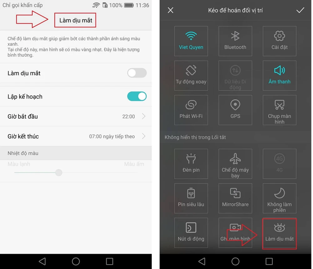 Đa phần các smartphone chạy Android 6.0 đều có tính năng “Chế độ ban đêm” (Night mode). Lưu ý, tên các tính năng có thể thay đổi tùy vào mỗi nhà sản xuất, đơn cử như tính năng này trên Xiaomi sẽ được gọi là “Chế độ đọc sách” hoặc “Làm dịu mắt” đối với Huawei. Để kích hoạt, bạn chỉ cần kéo thanh thông báo xuống và bấm chọn.