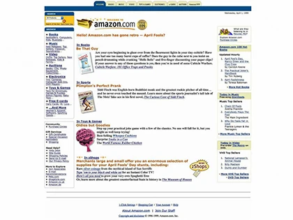 Trong năm 1999, nỗi sợ hãi Y2K lơ lửng trong không khí và mua bán online vẫn còn là một điều viễn tưởng. Amazon đã trở lại năm 1999 vào ngày Cá tháng tư – Toàn bộ site được thiết kế trông giống hệt như 16 năm trước.