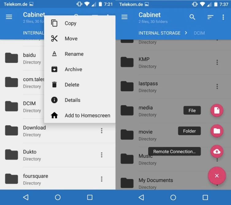 Cabinet (http://goo.gl/pGr0ft) là một ứng dụng quản lý tập tin khá hay cho Android, nó cung cấp nhiều tính năng để người dùng tiết kiệm được nhiều thời gian hơn khi thao tác. Tốc độ nhanh, dễ sử dụng, giao diện đẹp mắt, tuân thủ quy tắc thiết kế của Google, hỗ trợ truy cập vào thư mục root, dễ dàng chuyển hướng và truy cập vào máy chủ từ xa (FTP trên SSH).