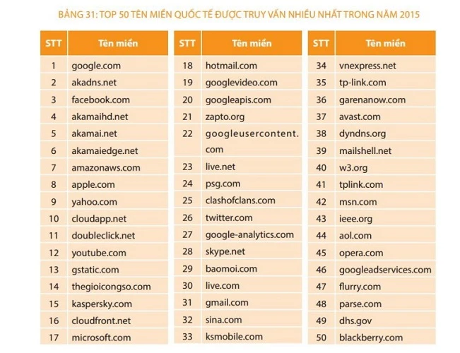 Báo cáo cũng liệt kê Top 30 tên miền quốc tế được truy vấn nhiều nhất, dẫn đầu là google.com, thứ ba là facebook.com, kế đến là những tên tuổi quen thuộc như apple, yahoo, hotmail, thegioicongso.com, plo.vn, gmail.com, plo.vn...