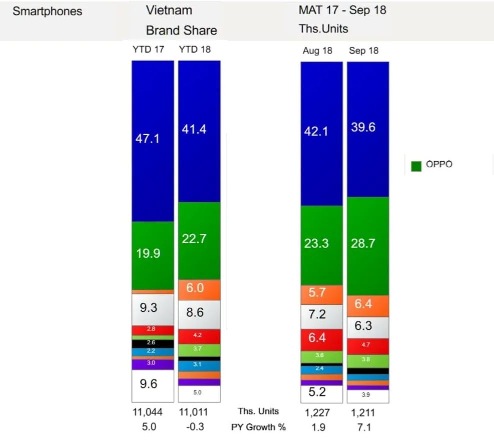 OPPO giữ vững vị trí thứ 2 thị trường, nhưng đã thu hẹp đáng kể khoảng cách với vị trí dẫn đầu và bỏ xa các thương hiệu khác. Công ty hiện đang dẫn đầu ở cả 2 phân khúc: từ 3 - 5 triệu và từ 7 - 10 triệu đồng, nhờ sự thay đổi trong loạt smartphone mới và việc tập trung vào 2 sản phẩm chiến lược là OPPO A3s và OPPO F9.