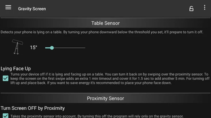 Nếu bạn muốn các thao tác này được thực hiện hoàn toàn tự động thì Gravity Screen là một ứng dụng rất thích hợp. Tiện ích này sẽ tự động mở khóa điện thoại mỗi khi phát hiện các chuyển động, hay nó sẽ tự khóa màn hình nếu người dùng đặt điện thoại lên bàn (ngửa lên hoặc úp mặt xuống).