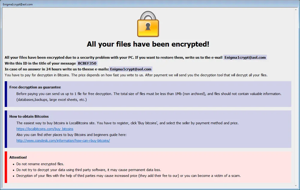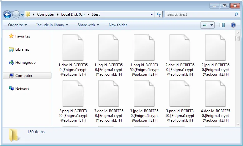 Các bài Test cho thấy mã độc Dharma đang mã hóa các file trong máy tính bằng cách thêm đuôi mở rộng ETH, đồng thời kèm theo email để liên lạc với kẻ đã tấn công và mã hóa máy tính của nạn nhân Engima1crypt@aol.com.
