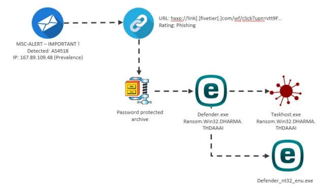 Mã độc này được các Hacker phân tán trên mạng internet thông qua hình thức Spam Email có đính kèm Dharma lưu trữ dưới dạng nhị phân, mỗi Email kèm theo mật khẩu riêng, trong đó sẽ có 1 định dạng file là Defender.exe và có máy chủ đặt tại Server của Hacker link[.]fivetier[.]com.