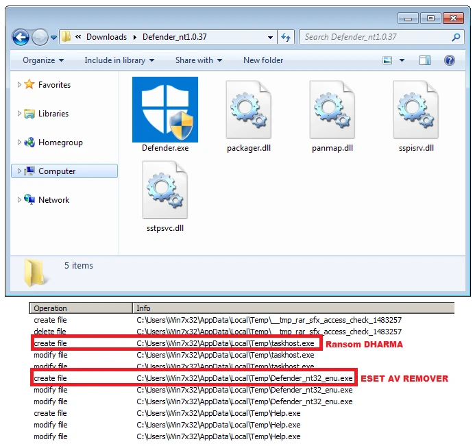 Mỗi khi file Defender.exe được nạn nhân bấm vào, nó sẽ hiển thị bằng giao diện cài đặt cũ của phần mềm diệt virus ESET dưới tên là Defender_nt32_othy.exe , và song song là một file taskhost.exe được thêm vào C:\ProgramData\Microsoft\Windows\Start Menu\Programs\Startup\ đây chính là lúc Dharma khởi chạy và bắt đầu tiến trình mã hóa dữ liệu của nạn nhân cho mục đích tống tiền.