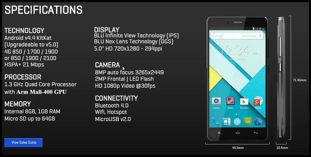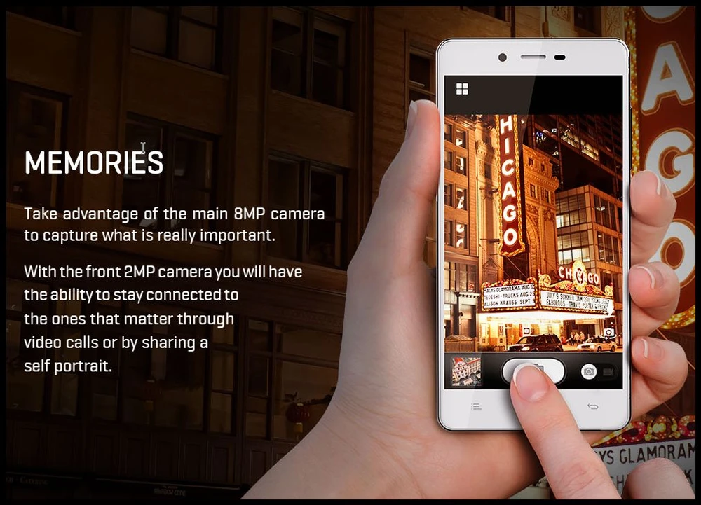Ngoài dung lượng pin khủng, máy còn có một cấu hình khá ổn với màn hình 5 inch 720 x 1280 pixel, camera phía sau 8 MP, camera 2 MP ở mặt trước và chạy hệ điều hành Android KitKat có thể nâng cấp lên Android 5.0 Lollipop. Bên trong máy sở hữu chip MediaTek bốn nhân tốc độ 1.3 GHz, RAM 1 GB, 8 GB bộ nhớ trong có khe thẻ nhớ mở rộng. Kích thước máy là 144,5 x 71,45 x 10,4 mm.