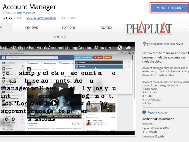 - Bước 1: Đầu tiên, bạn hãy cài đặt tiện ích Account Manager tại địa chỉ https://goo.gl/tKMjj0, nhấn Add to Chrome > Add extension.