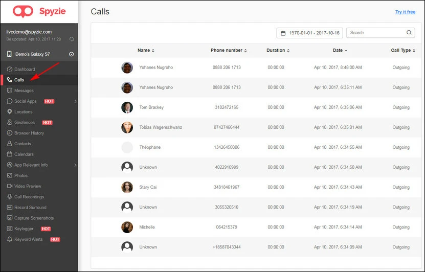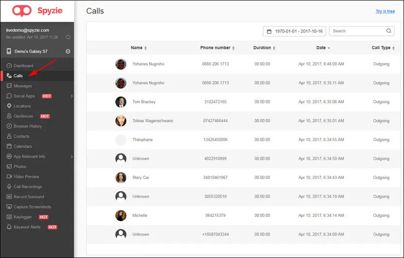 Giao diện của trung tâm điều khiển khá đơn giản với các chức năng chính nằm ở khung bên trái. Spyzie cho phép bạn xem toàn bộ lịch sử cuộc gọi trên chiếc smartphone bị theo dõi, mọi thông tin sẽ được liệt kê theo thời gian, bao gồm tên liên lạc, số điện thoại, thời gian gọi, thời lượng cuộc gọi...