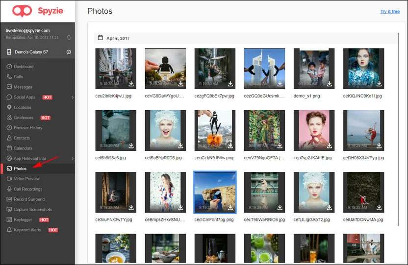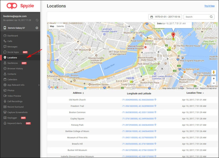 Bên cạnh đó, người dùng còn có thể xác định được vị trí chính xác của thiết bị hoặc những nơi đã đi qua thông qua tùy chọn Locations. Thậm chí, bạn còn có thể xem hoặc tải về tất cả video, hình ảnh, ảnh chụp màn hình trên thiết bị bị giám sát từ xa.
