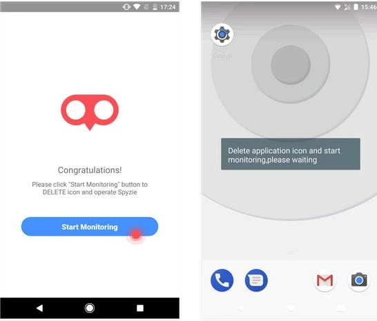 - Bước 3: Khi hoàn tất, bạn hãy mở ứng dụng Spyzie, cấp quyền và đăng nhập bằng tài khoản đã tạo khi nãy, sau đó nhấn Start monitoring. Lúc này, tự động biểu tượng của Spyzie sẽ tự động được xóa khỏi màn hình chính và chạy ngầm để tránh bị phát hiện.