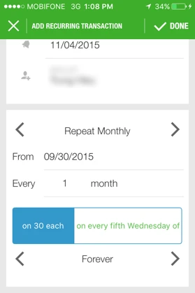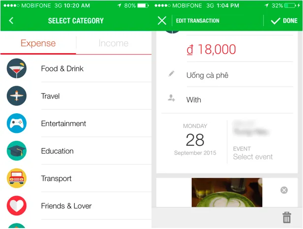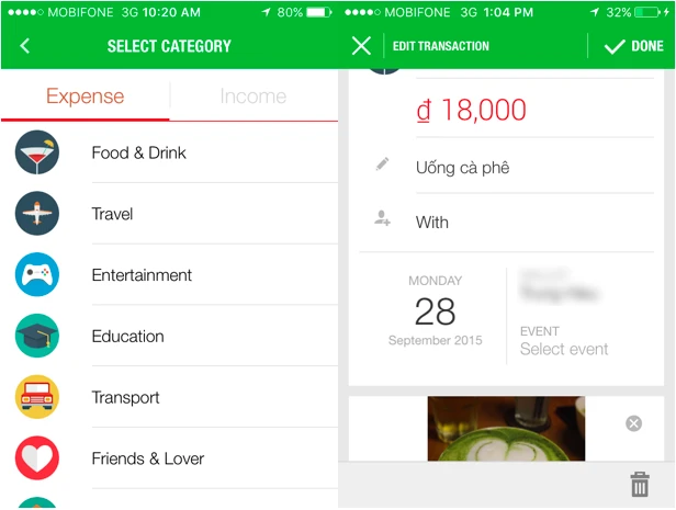 Để tạo một giao dịch mới, bạn nhấn dấu +. Tại đây sẽ gồm hai phần là Expense (chi tiêu) và Income (thu nhập). Với Expense, bạn có thể chọn danh mục chi tiêu ở phần select category gồm có food & drink (đồ ăn, thức uống), travel (đi du lịch), entertainment (giải trí), education (giáo dục)… Trong khi đó mục Income(thu nhập) sẽ giúp bạn quản lý các khoản lương (Salary), tiền thưởng (Award), tiền buôn bán (Selling), tiền được tặng (Give), tiền lợi nhuận (Interest money), tiền nợ (Debt) hay các khoản khác (Other).