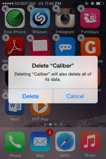Khi có hiệu ứng lung lay, bạn nhấn vào biểu tượng dấu X, chọn Delete ở thông báo xuất hiện để xác nhận việc xóa ứng dụng. Để sắp xếp lại ứng dụng, bạn chỉ việc kéo thả ứng dụng đến vị trí mới trên màn hình Homescreen.