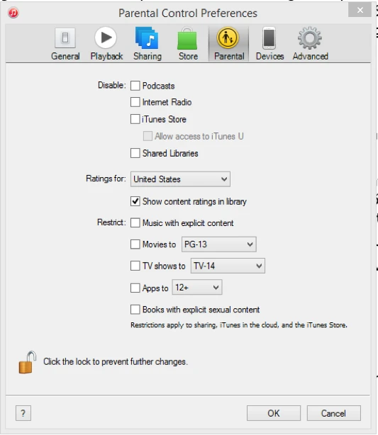Chế độ này giúp cho các bậc cha mẹ dễ dàng quản lý việc sử dụng thiết bị của con cái, và đồng thời cũng làm mất đi khả năng tải ứng dụng. Trên iTunes bạn vào Edit > Preferences, chuyển qua thẻ Parental và bỏ dấu chọn ở phần iTunes Store rồi nhấn OK.