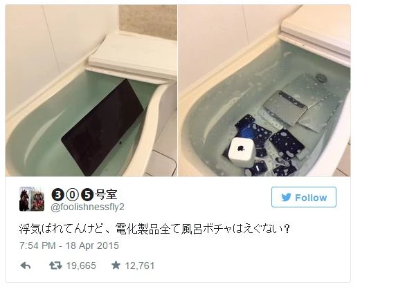 Không có gì đau khổ bằng việc nhìn những chiếc iMac, iPhone, iPad… yêu quý lần lượt được “tắm rửa” mà không thể làm gì được. Và để chứng minh mình đã chính tay thực hiện điều đó, cô nàng còn chụp một bức ảnh bao gồm tất cả những thiết bị công nghệ của anh chàng này trong bồn nước và gửi cho người yêu.