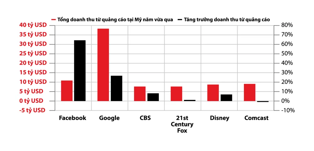Trong vài tháng vừa qua, doanh thu từ quảng cáo nội địa của Facebook đã vượt mặt các công ty như Comcast, CBS Corp, Disney, và 21st Century Fox. 13,1 tỉ USD mà mạng xã hội này và Google thu về trong quý II-2016. Thậm chí đã vượt qua tổng doanh thu cùng kỳ của bốn ông lớn truyền hình (con số doanh thu nội địa của Facebook bao gồm cả Canada, trong khi doanh thu của Google chỉ tính riêng tại Mỹ).